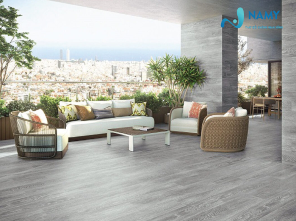 Nếu bạn là một người thích sự tối giản, gần gũi mang hơi hướng thiên nhiên thì có thể lựa chọn gạch màu xám khói vân gỗ, vừa nhẹ nhàng, vừa ấm áp.