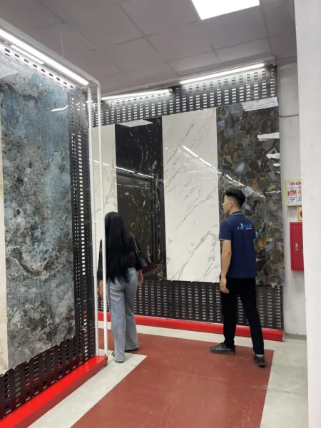 Gạch khổ lớn: Tạo hiệu ứng không gian liền mạch, sang trọng, phù hợp với phòng khách, sảnh lớn hoặc mặt tiền.