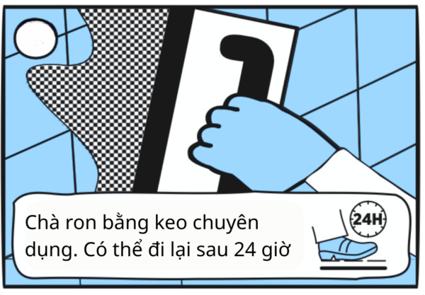 Sau khoảng 24 giờ, tiến hành chà ron bằng bột chuyên dụng. Chọn màu ron phù hợp với màu gạch để tăng tính thẩm mỹ. Lau sạch và giữ ẩm nhẹ trong 1–2 ngày đầu để ron ổn định.