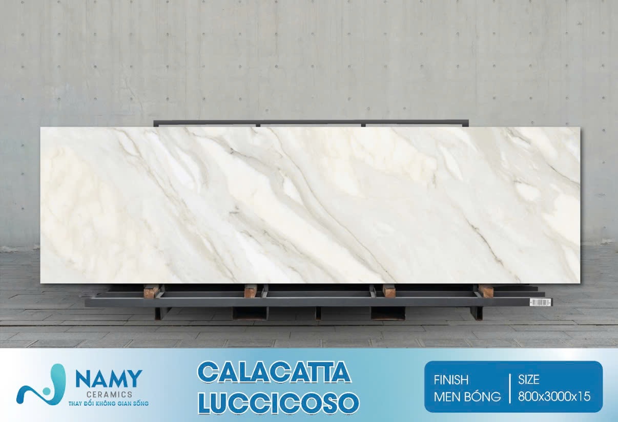 Tên gọi khác: Đá nung kết màu trắng Calacatta Luccicoso, đá nung kết 800×3000 Calacatta Luccicoso, đá nung kết vân đá Calacatta Luccicoso.