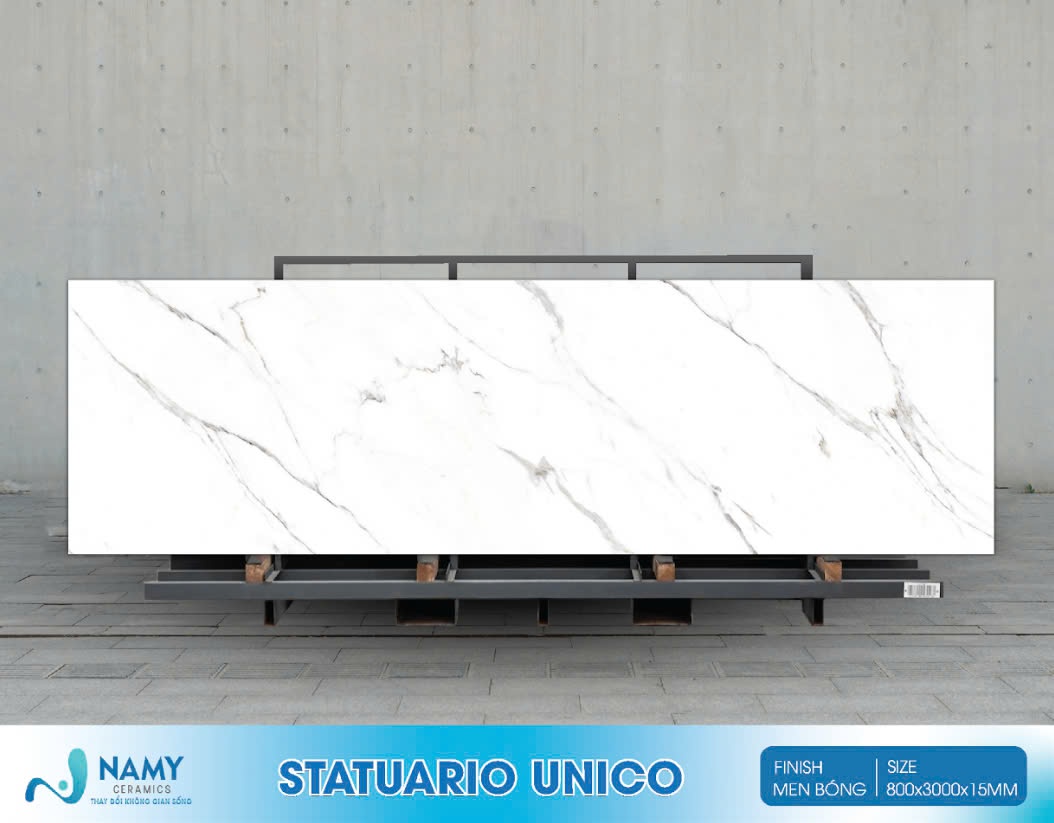 Tên gọi khác: Đá nung kết màu trắng Statuario Unico, đá nung kết vân đá Statuario Unico, đá nung kết Statuario Unico 800×3000.