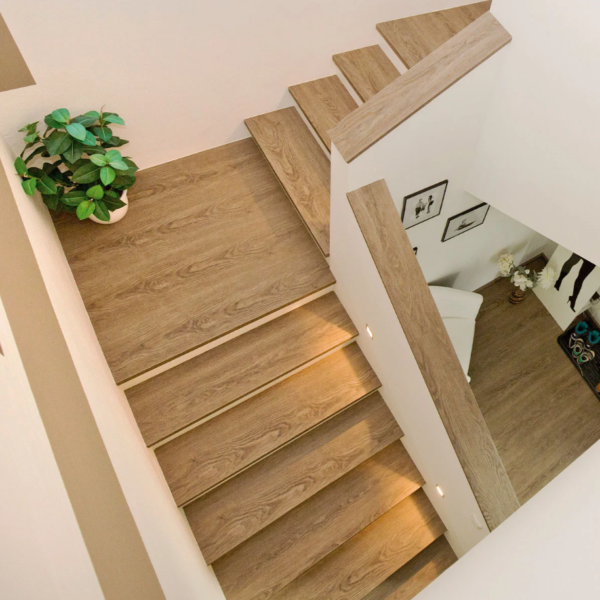 Bên cạnh gạch vân đá, gạch giả gỗ cũng là lựa chọn được nhiều gia đình yêu thích khi lát cầu thang. Loại gạch này tái hiện chân thực màu sắc và vân gỗ tự nhiên, mang lại cảm giác ấm áp và gần gũi cho không gian sống.