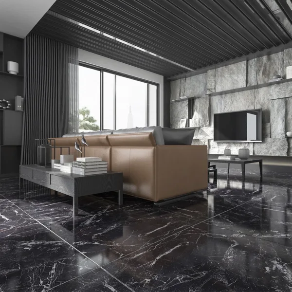 Gạch lát nền màu đen vân đá được ứng dụng rộng rãi trong nhiều công trình hiện đại. Đây là lựa chọn lý tưởng cho phòng khách, khu sảnh, hành lang, showroom, quán cà phê và các không gian thương mại cao cấp.