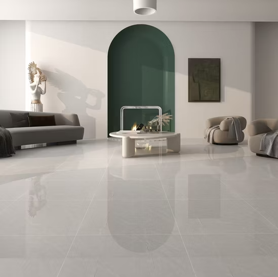 Phòng khách: Chọn gạch xám vân đá bóng nhẹ để tôn lên vẻ sang trọng. Kết hợp sofa sáng màu và ánh sáng vàng ấm tạo cảm giác ấm cúng.
