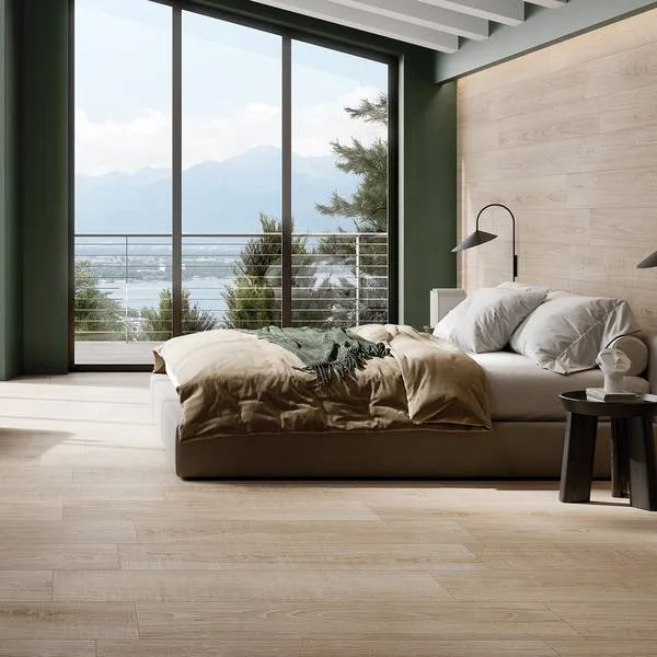 Màu sắc tự nhiên của gỗ như nâu nhạt, vàng kem hay xám tro giúp phòng ngủ trở nên nhẹ nhàng và dễ chịu. Các tông màu trung tính của gạch giả gỗ còn giúp dễ phối hợp với nội thất như giường, tủ, rèm cửa, tạo nên một tổng thể thống nhất và hài hòa.