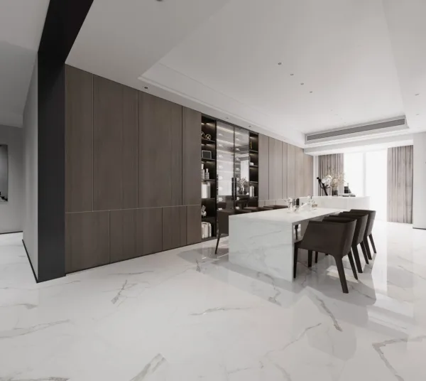 Chọn gạch vân đá màu sáng, khổ lớn (80×80, 60×120, 80×160) để mở rộng không gian và tôn lên vẻ sang trọng.
