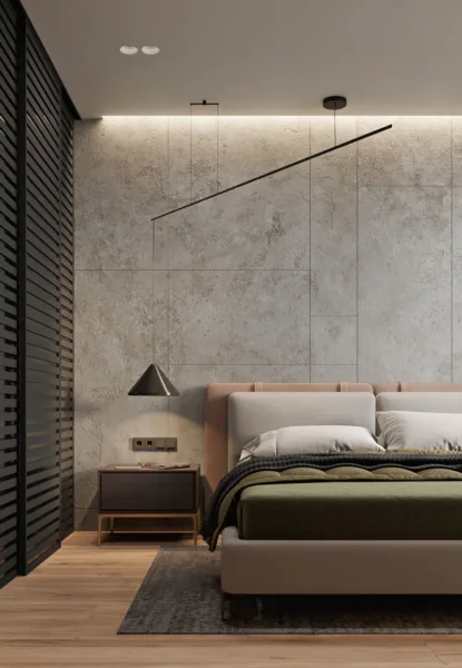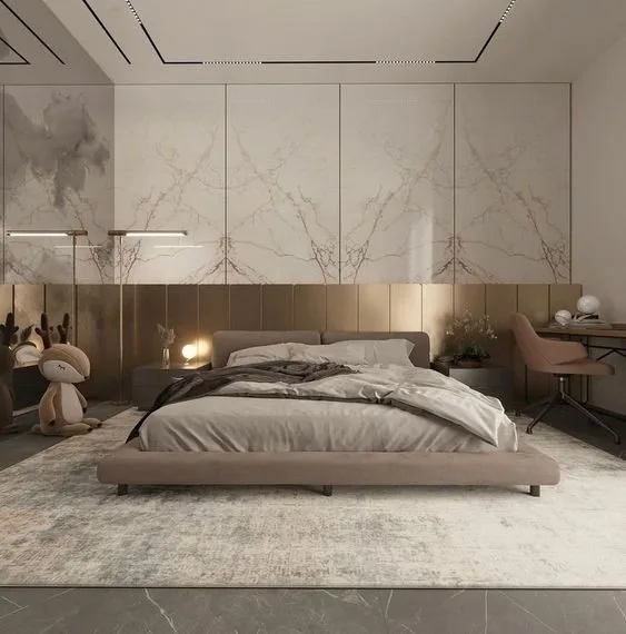 Việc thi công gạch cũng có thể linh hoạt tùy theo ý tưởng thiết kế. Bạn không nhất thiết phải ốp toàn bộ các bức tường mà có thể chỉ chọn một phần để tạo điểm nhấn. Ví dụ, một mảng tường phía đầu giường ốp gạch vân đá sang trọng, kết hợp với đèn âm tường sẽ tạo ra hiệu ứng ánh sáng ấm cúng và nghệ thuật.