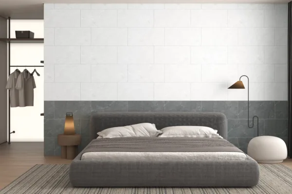 Gạch ốp tường phòng ngủ màu trắng nổi bật bởi gam màu trung tính, nhẹ nhàng và dễ ứng dụng. Bề mặt gạch thường được phủ lớp men cao cấp, có thể là men bóng hoặc men mờ, giúp tăng khả năng phản xạ ánh sáng và tạo cảm giác phòng ngủ rộng rãi hơn.