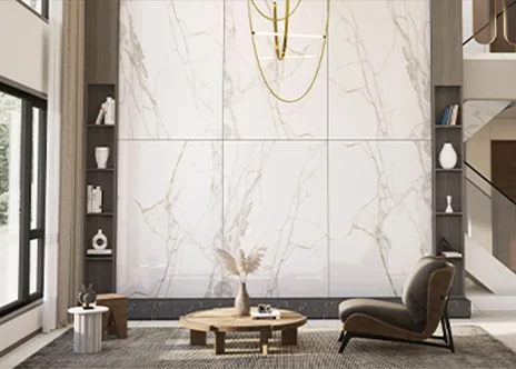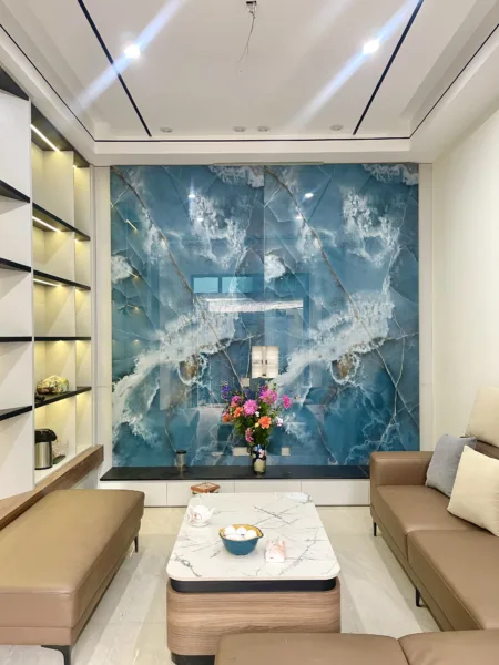 Phòng khách là không gian trung tâm của ngôi nhà, nơi thể hiện rõ nhất gu thẩm mỹ của gia chủ. Sử dụng gạch ốp tường trang trí vân đá, khổ lớn hoặc họa tiết tinh tế giúp tạo điểm nhấn ấn tượng cho mảng tường sau sofa hoặc khu vực kệ tivi.