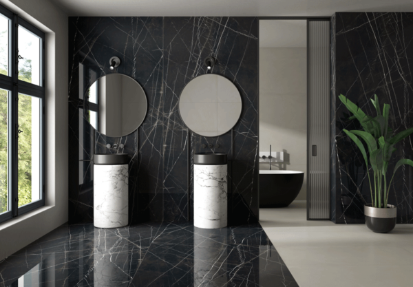 Trong không gian phòng tắm, gạch ốp vân đá đen tạo cảm giác spa thư giãn, riêng tư, thanh lịch. Đặc biệt khi kết hợp cùng gạch lát sàn vân đá trắng hoặc đá marble, không gian sẽ trở nên hài hòa và tinh tế.