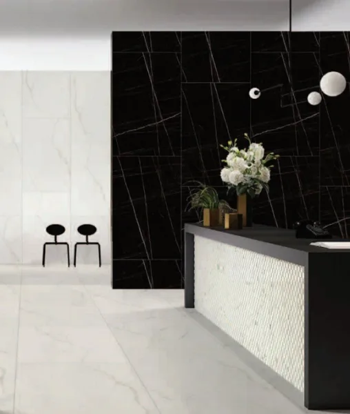 | Gạch porcelain vân đá đen | Siêu bền, chịu lực cao | Tường showroom, trung tâm thương mại |