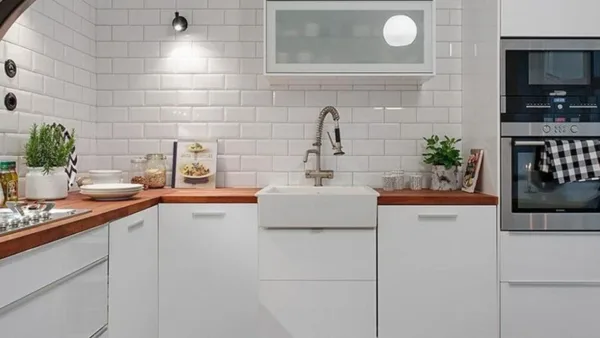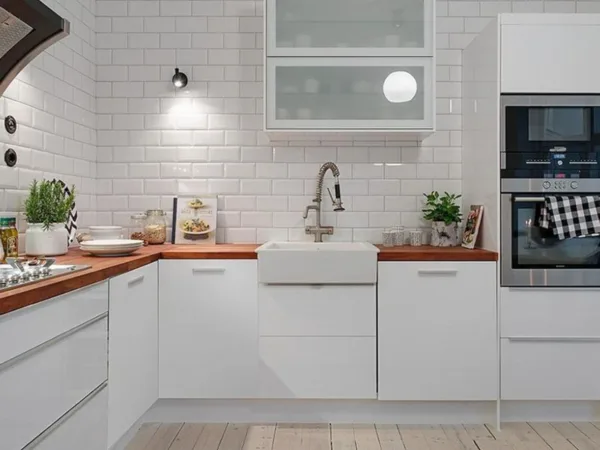 Diện tích bếp nhỏ → ưu tiên gạch thẻ màu sáng, men bóng để tạo hiệu ứng rộng rãi.