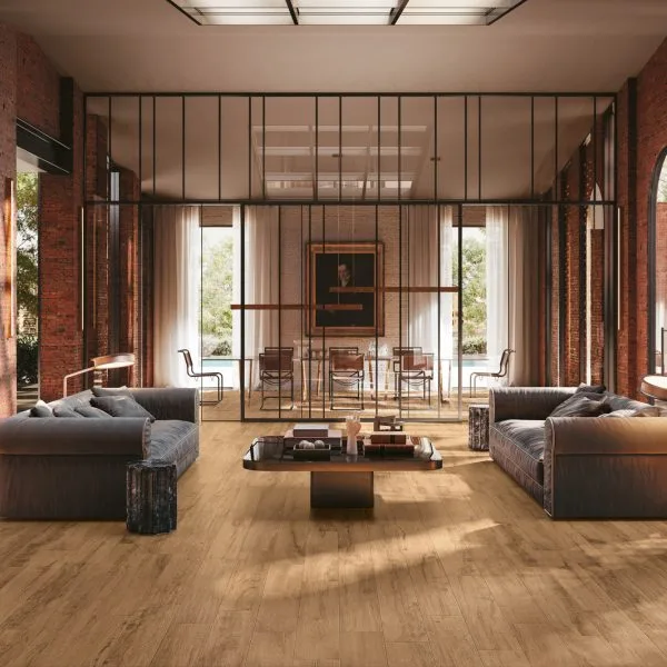 Gạch vân gỗ giúp phòng khách trở nên ấm áp, sang trọng mà vẫn dễ vệ sinh, phù hợp cho gia đình có trẻ nhỏ.