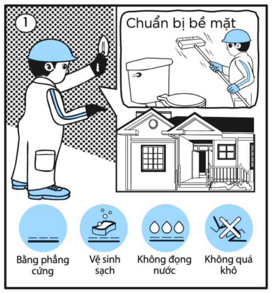 Bề mặt nền hoặc tường cần được làm sạch bụi bẩn, dầu mỡ và xử lý các vết nứt nếu có. Bề mặt nên bằng phẳng, khô ráo và chắc chắn để keo phát huy tối đa hiệu quả kết dính.