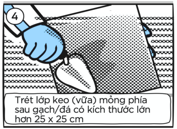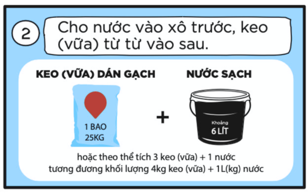 - Không nên trộn keo quá nhiều trong một lần, nên chia nhỏ từng mẻ để tránh keo bị khô giữa chừng. Nếu gạch có mặt sau quá nhẵn hoặc bị phủ bụi, nên vệ sinh sạch và có thể tạo nhám nhẹ.