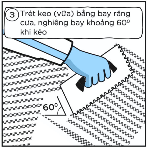 Dùng bay răng cưa để phết keo lên bề mặt cần lát, tạo thành lớp mỏng đều. Chiều dài răng cưa tùy vào kích thước gạch (thường từ 6 – 12mm). Với gạch lớn, nên phết keo cả dưới viên gạch để tăng độ bám.