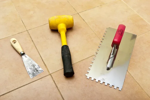 • Chuẩn bị vật liệu: Gạch ốp, keo dán gạch (hoặc vữa xi măng), bay răng cưa, thước cân bằng, búa cao su, miếng chèn khe (ke gạch).