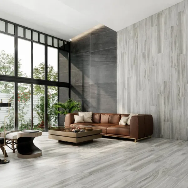 Không gian mở: Sử dụng gạch thẻ giả gỗ cho cả sàn và tường để tạo sự đồng bộ và kéo dài thị giác.