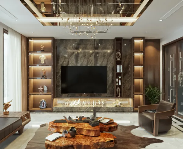 Đá nung kết ốp tường kệ tivi làm nổi bật không gian phòng khách