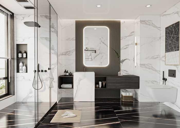 Một trong những mẫu gạch ốp lát nhà vệ sinh đẹp nhất vân đá Venatino Grey+Pietra Noir