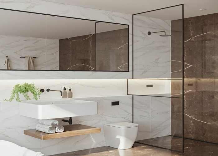 Một trong những mẫu gạch ốp lát nhà vệ sinh đẹp nhất vân đá Venatino Grey+Pietra Noir;  Gạch Sarona Natural rất phù hợp để lát phòng tắm – Gạch ốp lát Botocino theo phong cách hiện đại, tối giản – Mẫu gạch ốp Botocino màu trắng kết hợp với gạch lát màu nâu