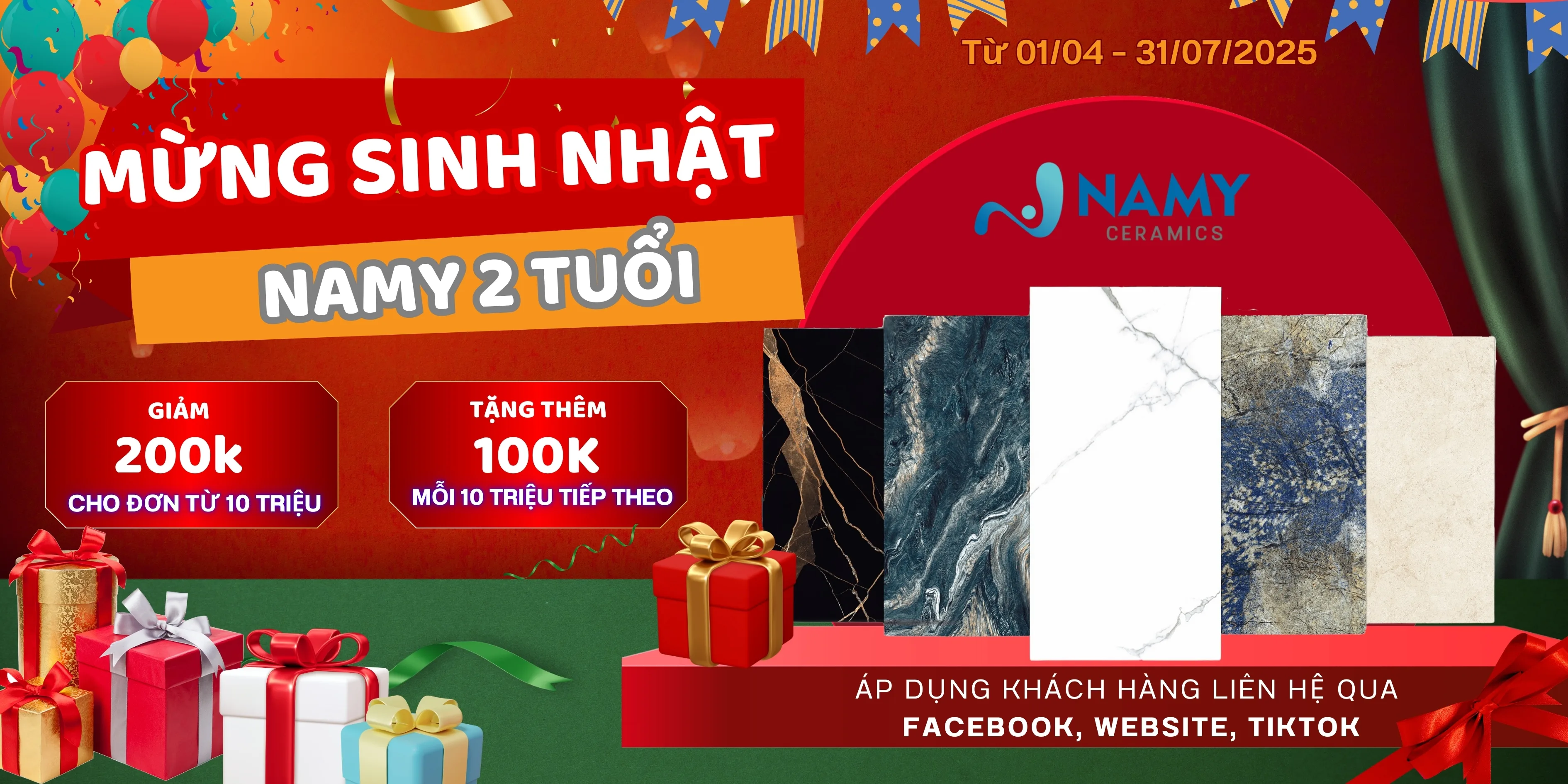 Mừng kỷ niệm 2 năm hình thành và phát triển, những viên gạch đầu tiên được xây dựng góp phần chung tay phát triển mọi công trình bền vững 1/4/2023 – 1/4/2025, Namy Ceramic dành tặng khách hàng voucher cực lớn và có giá trị cộng dồn. Chương trình là món quà tri ân, lời cảm ơn chân thành gửi tới tất cả khách hàng đã đồng hành cùng Namy trên hành trình chinh phục những công trình mới, góp phần mang tới giá trị cuộc sống và thẩm mỹ cho công trình.