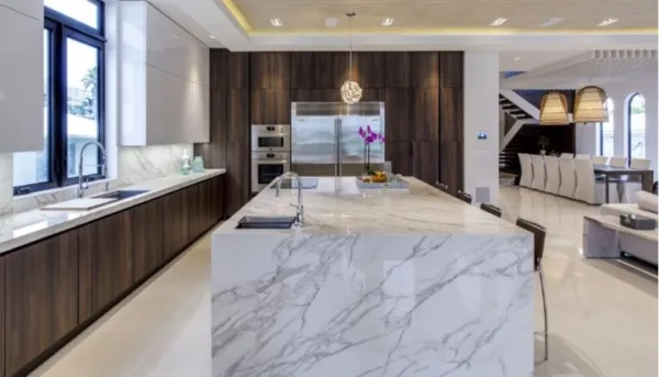 • Đá tự nhiên (marble, granite, thạch anh): Mang vẻ đẹp sang trọng, vân đá tự nhiên tinh tế, tạo điểm nhấn nổi bật cho khu vực nấu nướng.