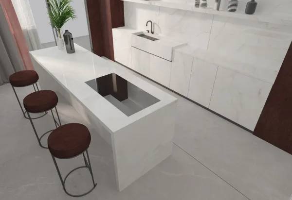 • Đá nung kết: Chất liệu cao cấp với khả năng chống trầy xước, chịu nhiệt tốt và không thấm nước, mang lại vẻ đẹp liền mạch, hiện đại cho căn bếp.