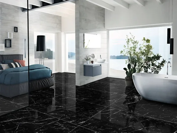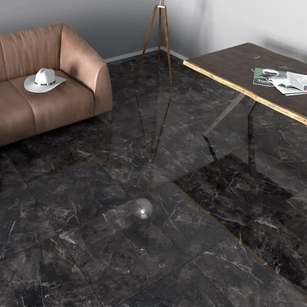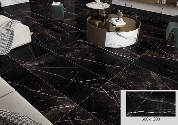 Với khả năng tạo chiều sâu và vẻ sang trọng, gạch giả đá hoa cương màu đen là lựa chọn hoàn hảo cho không gian phòng khách hoặc sảnh đón. Khi kết hợp với ánh đèn vàng hoặc nội thất kim loại, gạch sẽ làm nổi bật không gian một cách ấn tượng.