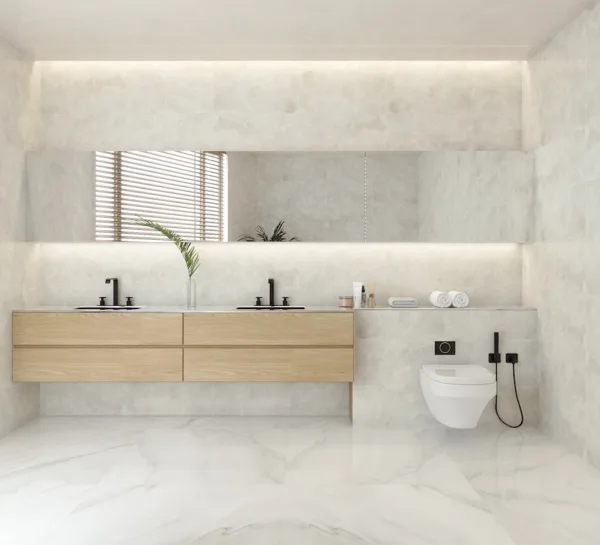 Với vẻ ngoài tự nhiên như đá thật, gạch marble luôn được ưa chuộng trong thiết kế phòng tắm cao cấp. Tông màu như trắng, kem nhạt, xám và xanh ngọc tiếp tục thống trị trong năm 2025.